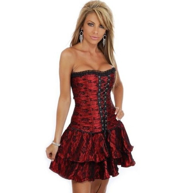 В комплекте юбка и корсет. Спереди украшено цветком на миниатюрной булавке, который можно отстегнуть при необходимости. Ткань двойная. Атлас сверху прошит черной полупрозрачной сеткой с игривым орнаментом.