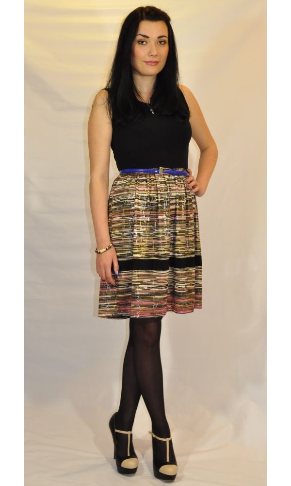 Великолепное платье с пышной юбкой, плотно прилегающее сверху. Однотонная вставка на юбке изделия подчеркивает скромность наряда, и в то же время делает его необычным.