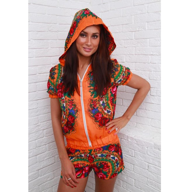 Костюм российских дизайнеров насыщенного оранжевого цвета с ярким цветочным орнаментом в стиле петриковской росписи.Олимпийка имеет капюшон и два кармана, манжеты, низ кофты и пояс на резинке, что позволяет удобно зафиксировать костюм в нужном положении. Шорты костюма свободного кроя с заниженной талией. Костюм идеально подойдёт для прогулок, вечеринок и подчеркнёт все достоинства женской фигуры. Cостав: 95%Сotton, 5%Lycra